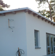 Das flach geneigte Pultdach mit Aufsparrendämmung besteht aus sichtbaren gehobelten Sparren und gehobelten Brettern darüber...