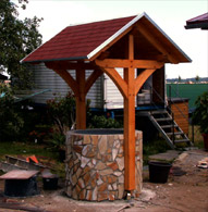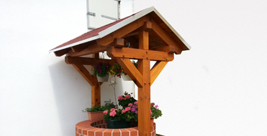Brunnen mit Satteldach Als gestalterisches Element auf einem Grundstück im Ortsteil Schadewalde (links) und Zahna (rechts) entstanden diese Brunnen mit Satteldach.