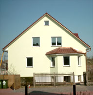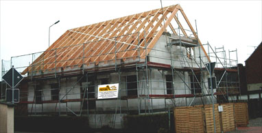 Neubau Wohnhaus in Seyda Dieser Pfettendachstuhl mit Dacherker hat Sparren aus amerikanischen TJI-Trägern 335mm hoch. Dadurch kann die Wärmedämmung in Passivhaus-Qualität realisiert werden, bei gleichzeitig hoher Tragfähigkeit und geringem Gewicht.