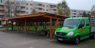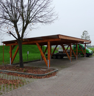 Carport Wittenberg Dieser Carport ist für 5 PKW geplant. Durch jeweils nur zwei Pfosten mit Strebe bleibt mehr Platz für die Öffnung der Türen. Eindeckung mit Stahltrapezblech ausgebaut.