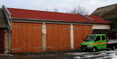 links:ehemaliger Bauernhof Sie sehen das neue Hoftormit integriertem "Schlupftor" rechts:Fahrzeuggarage Agrargenossenschaft Feldheim